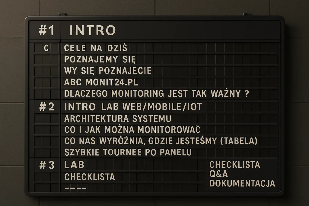 Pierwsze koty za płoty. A taki warsztat to wstęp do przygotowań Akademii Monit24. Wydarzeń, na których będziecie mogli podnosić swoje umiejętności z obszaru całego observability przy użyciu narzędzi do monitoringu usług internetowych.