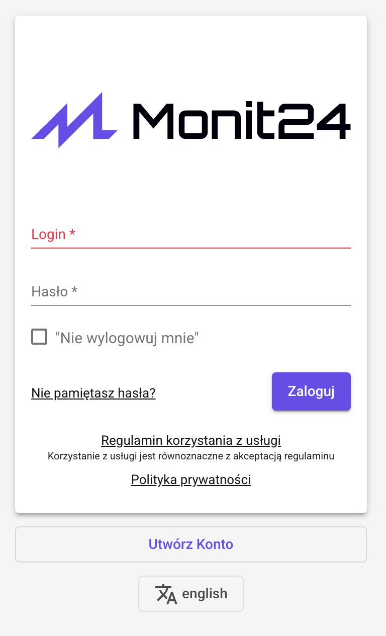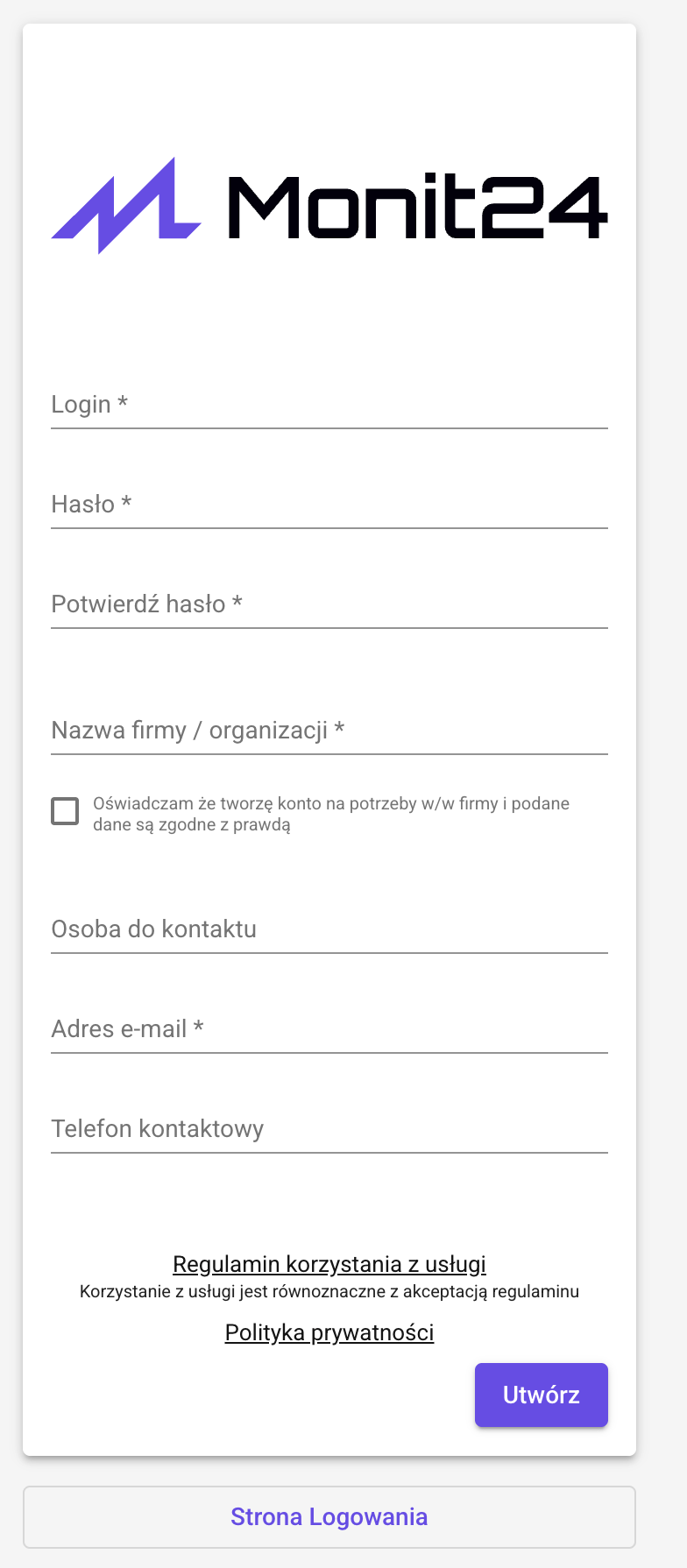 Zakładając konto, wymagana jest akceptacja Regulaminu Monit24, dostępnego pod adresem: https://monit24.pl/regulamin.pdf