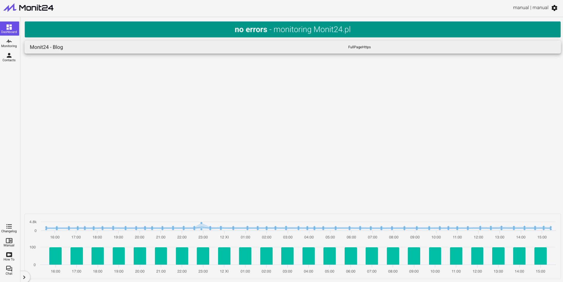 Administrator systemu monit24.pl udzieli dalszych wskazówek i pomoże utworzyć regułę wg wyrażenia regularnego. Przykładowe wyrażenia regularne:^<HTML>– kod strony musi zaczynać się od <HTML>;(<div>){3,5}– od strony musi zawierać od 3 do pięciu sekcji <div>;</HTML>$– kod strony musi się kończyć na </HTML>;^<\!DOCTYPE html>.*?(<img src=){3,}.*?strona www.*?</html>$– kod strony musi zaczynać się od <HTML>.