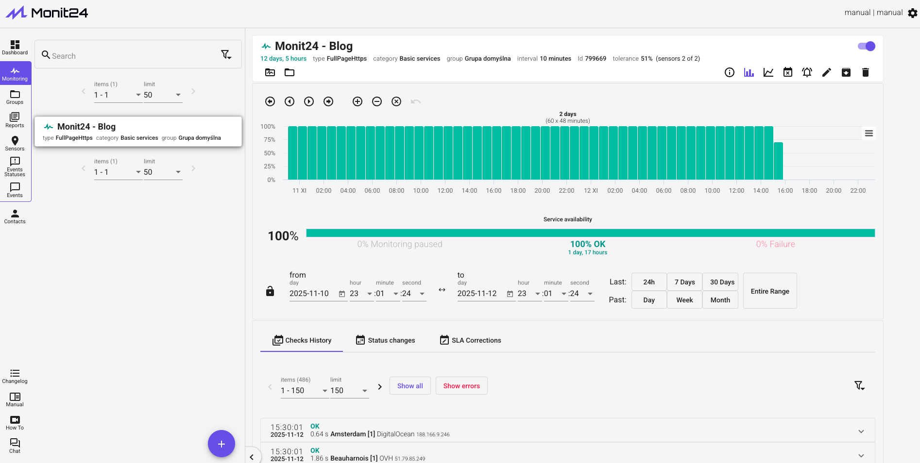 W następnej linii Użytkownik może przejść za pomocą ikon do widoku grupy, w której znajduje się wyświetlana usługa, oraz nawigować pomiędzy innymi zakładkami w panelu usługi. W następnej sekcji znaleźć można informację o długości aktualnie trwającego stanu usługi i wywołać natychmiastowe sprawdzenie.