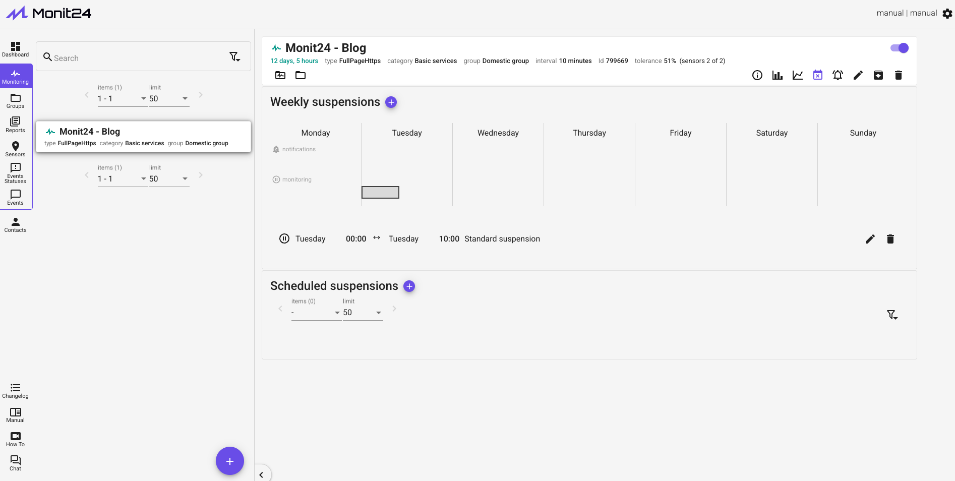 W zakładce godziny zawieszeń użytkownik może zdefiniować pojedyncze lub cykliczne (na planie tygodnia) godziny planowanego przerwania działania usługi w panelu Monit24.