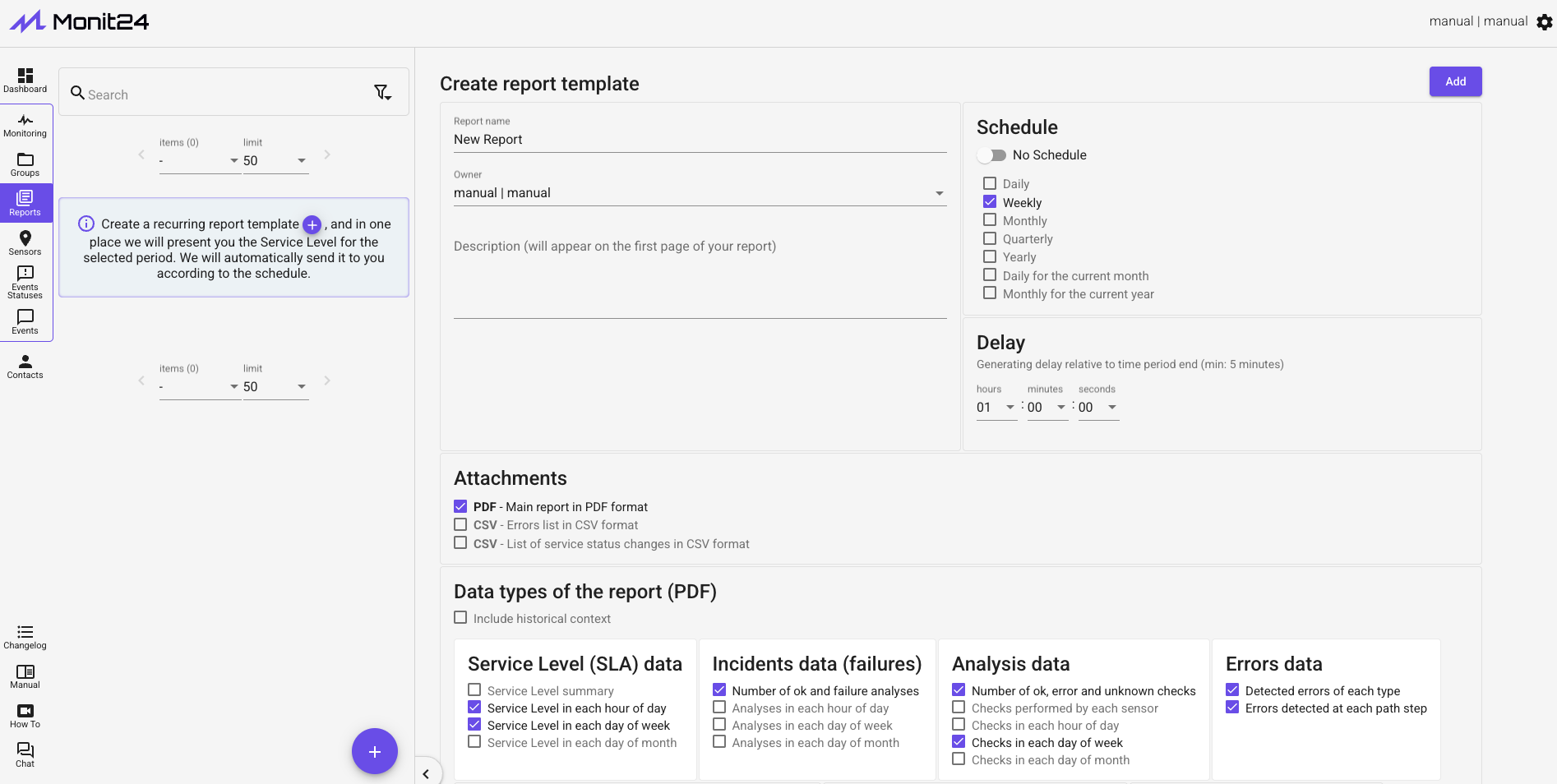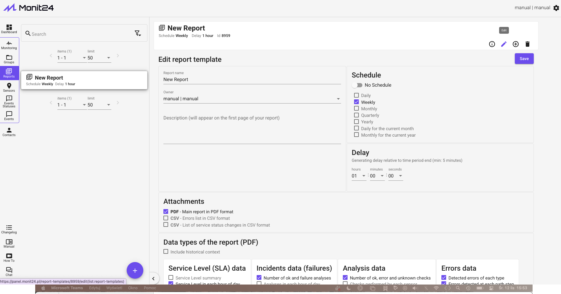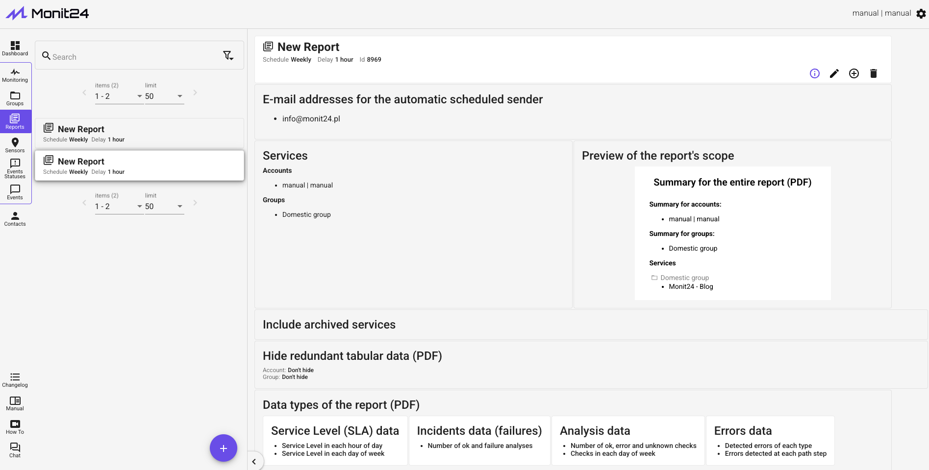 Monit24.pl w Panelu oferuje możliwość tworzenia dwóch typów raportów, pod względem sposobu realizacji: