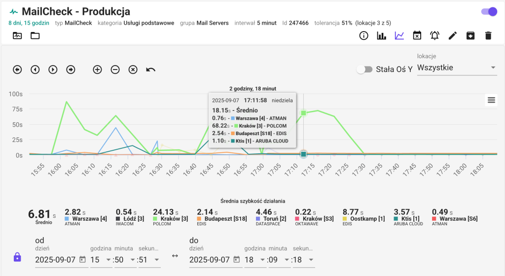 Przy każdym uruchomieniu się testu MailCheck, sprawdzane jest czy poprzedni e-mail dotarł poprawnie oraz wysyłany jest nowy testowy e-mail. Ustawienie częstotliwości sprawdzeń ma tu dodatkową rolę, odzwierciedla czas jaki maksymalnie dajemy wiadomości e-mail na dotarcie do końcowego adresata. Jeśli usługa ma ustawiony harmonogram sprawdzania co 10 minut, wówczas zakładamy, że przesłana poczta powinna trafić w ciągu tego czasu do miejsca docelowego. Jeżeli ta się nie stanie, zgłaszany jest problem z odpowiednim kodem błędu i dodatkowymi informacjami na temat przesłanej wiadomości testowej. Ze względu na różnego rodzaju mechanizmy antyspamowe (np. greylisting) zalecamy, aby częstotliwość sprawdzeń nie była wyższa niż co 5 minut. Dodatkowo możliwe jest, aby testy wykonywane były z różnych lokalizacji w sieci Internet (np. u kilku głównych providerów w Polsce oraz jednego lub dwóch z zagranicy). To da nam dodatkowe potwierdzenie że bez względu na sieć z której następuje połączenie do serwera pocztowego, proces odbioru i przesyłania wiadomości działa poprawnie. W ramach eskalacji zdarzeń, Monit24 pozwala zdefiniować powiadomienie ostrzegawcze, gdy problem wykryto tylko na części lokalizacji, lub powiadomienie o awarii gdy wszystkie lokalizacje potwierdzą brak możliwości przesłania e-maila testowego.